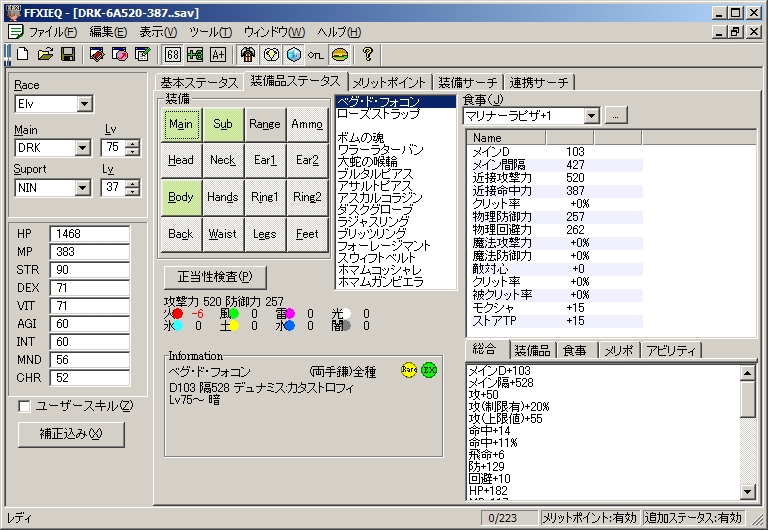 攻撃力:520 命中:387 STR:90 sTP:+15 ヘイスト:19%