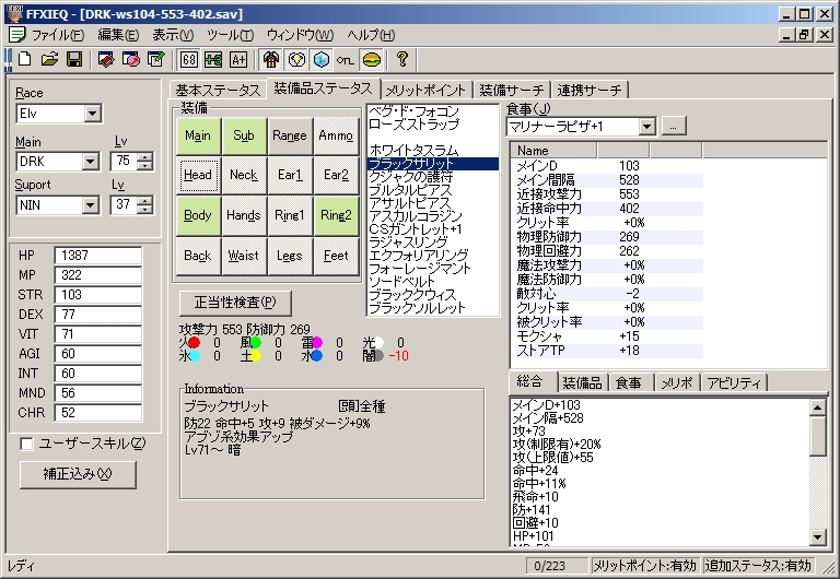 攻撃力:553 命中:403 STR:104 MND:56 INT:60 sTP:+18