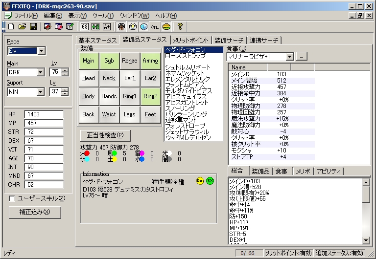 精霊魔法スキル:263 INT:90 魔法命中率:+4 魔法命中:+2 魔法攻撃:+15